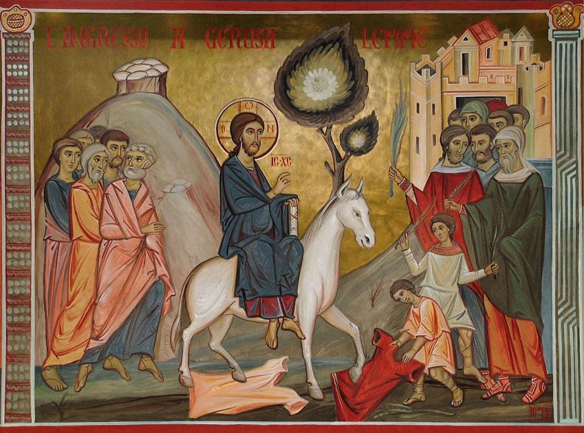 Unii își aștern hainele înaintea Lui. Mai toți strigă: „Osana” („Doamne, mântuiește-ne!”) „Binecuvântat este Cel ce vine întru numele Domnului”. Pare că își dau seama că Fiul lui Dumnezeu a venit pe pământ, ca să-i mântuiască. Cei mai mulți Îl privesc însă ca pe un împărat lumesc, închipuindu-și că El este cel care îi va elibera de stăpânirea romanilor. Nu știau că împărăția lui Hristos era, de fapt, Ierusalimul din Ceruri, în care va intra prin Învierea Sa. Intrarea în Ierusalimul evreilor anunță acest moment.