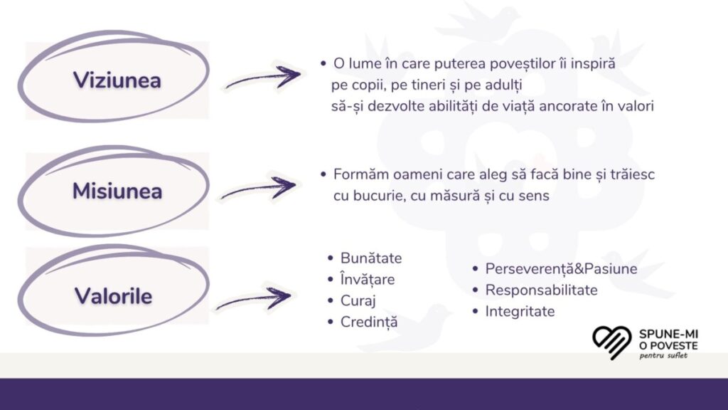 La „Spune-mi o poveste pentru suflet” ne dorim o lume în care puterea poveștilor îi inspiră pe copii, pe tineri și pe adulți să-și dezvolte abilități de viață ancorate în valori.