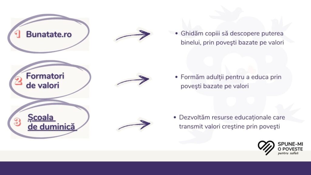 - Îi ghidăm pe copii să descopere puterea binelui, prin povești bazate pe valori.