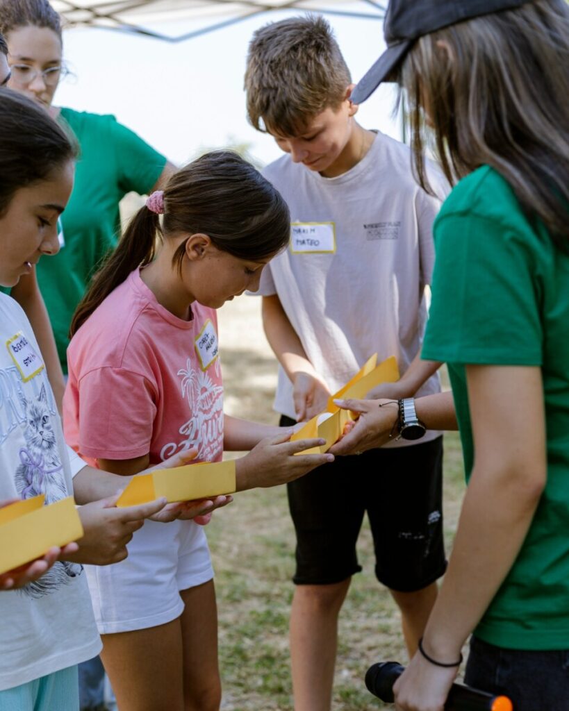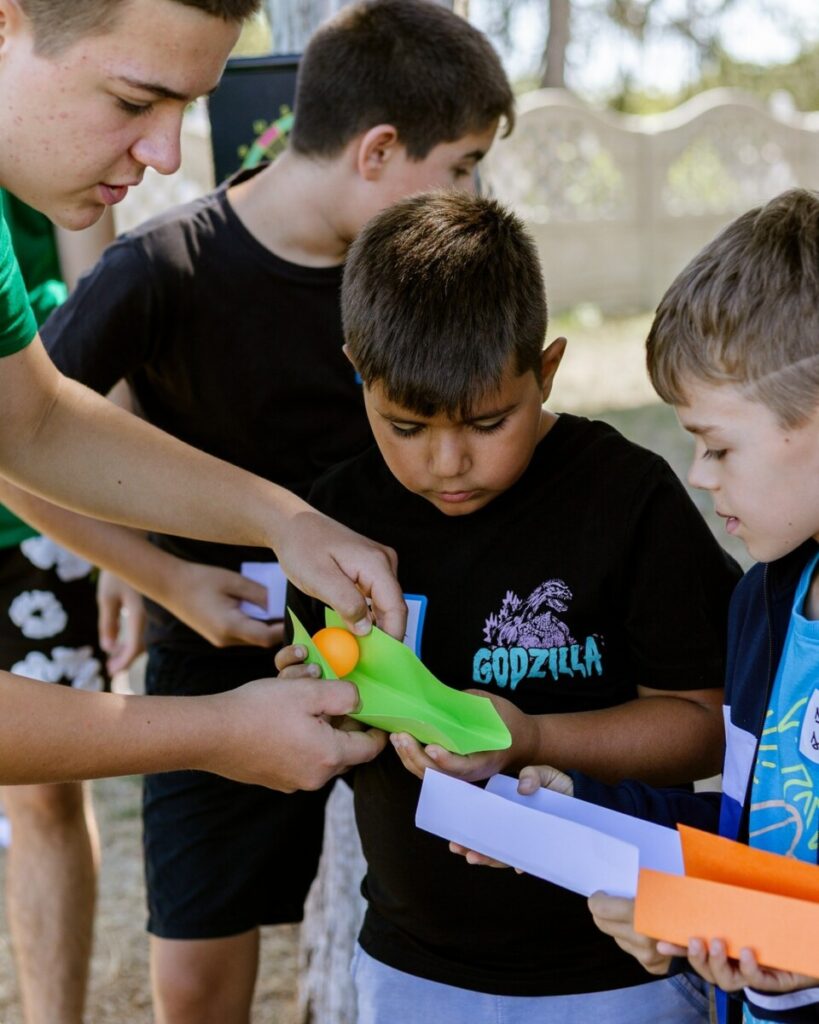 Fiecare copil primește o jumătare de foaie de carton A4, care e pliată astfel încât să formeze un jgheab.
